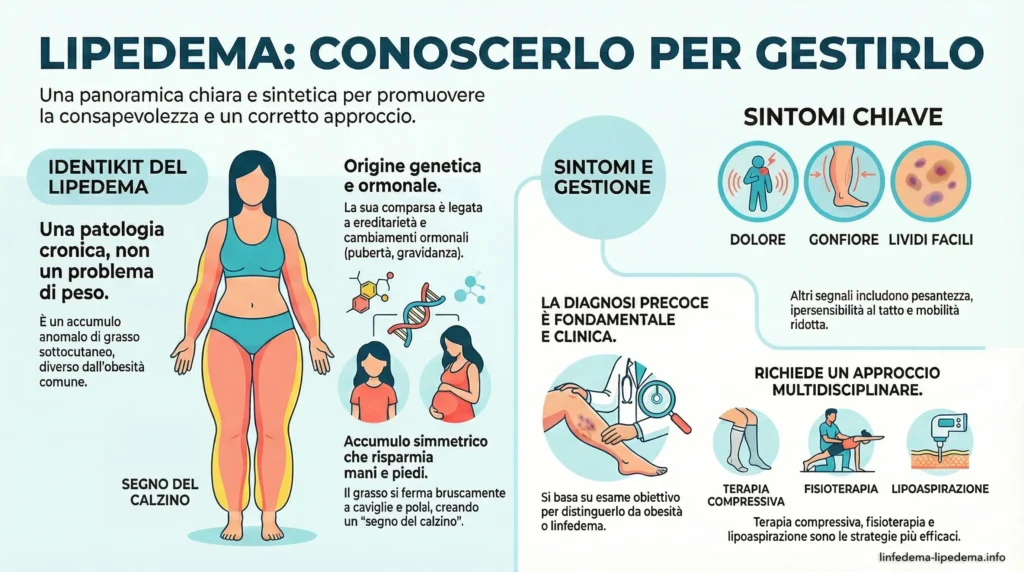 Il lipedema è una patologia cronica e progressiva del tessuto adiposo sottocutaneo, con forte componente genetica e ormonale, che si manifesta con accumulo simmetrico di grasso a gambe e braccia, dolore e facilità ai lividi. La diagnosi precoce e la gestione multidisciplinare sono fondamentali per prevenire complicanze e migliorare la qualità di vita di chi ne è affetto.