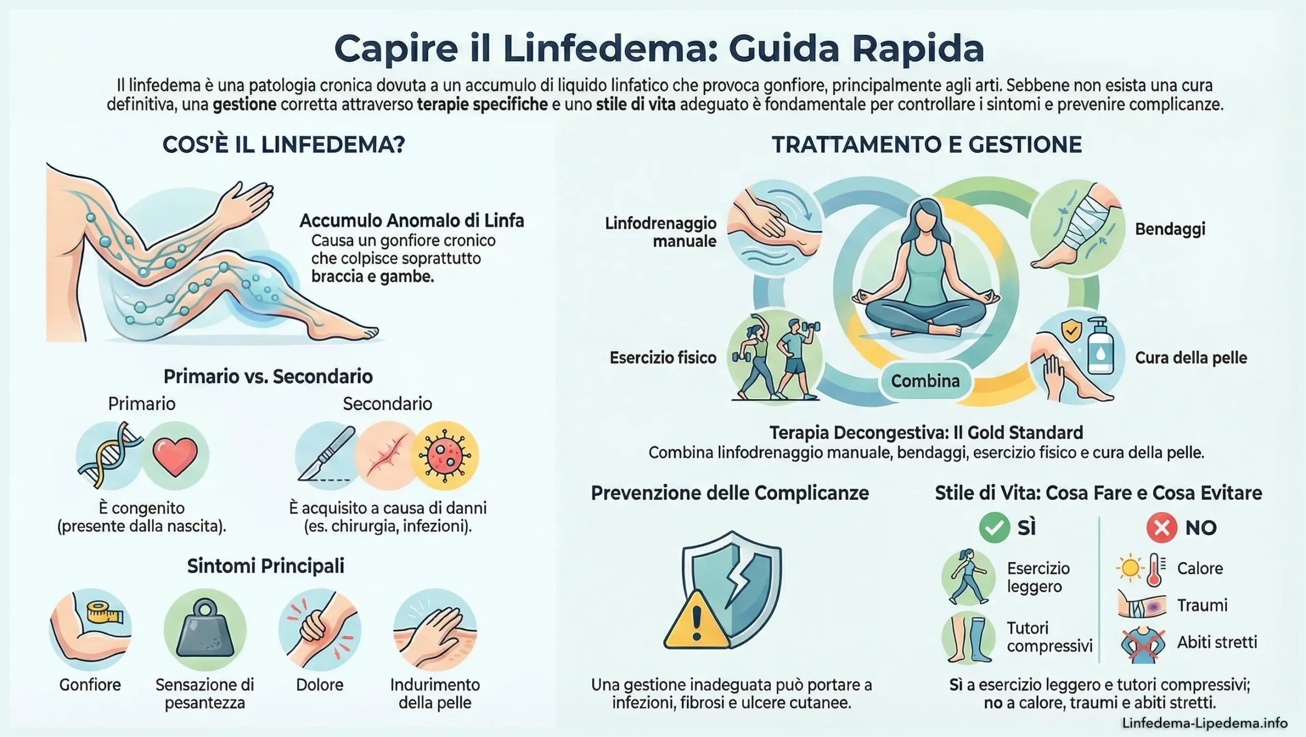 Il linfedema è una patologia cronica caratterizzata da un accumulo anomalo di liquido linfatico nei tessuti, che provoca gonfiore, soprattutto agli arti, ma può interessare anche altre parti del corpo come viso, collo o genitali[1][2][3].