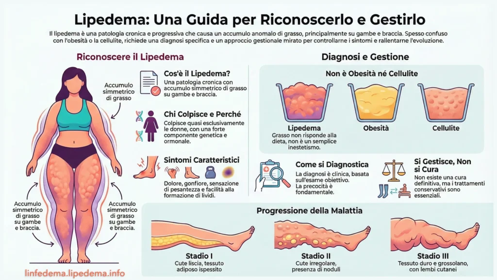 Sì, è una patologia progressiva che può evolvere verso stadi più avanzati e, se trascurata, può associarsi a linfedema (lipolinfedema)[1][2][4].