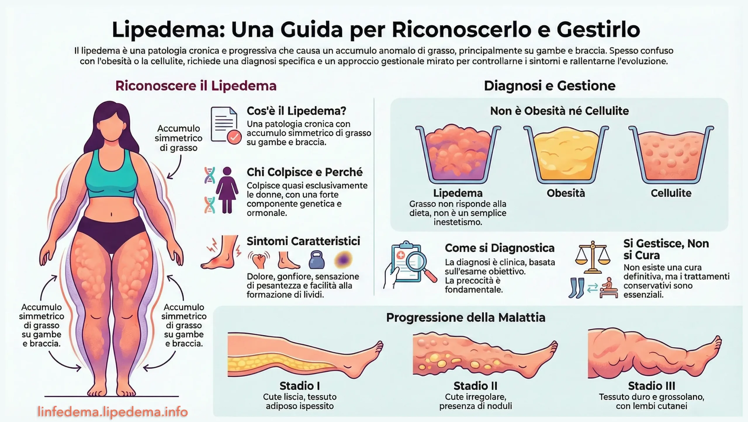 Nel lipedema il grasso si accumula simmetricamente su gambe e braccia, risparmiando mani e piedi, mentre nell’obesità l’accumulo è più generalizzato e risponde alla dieta e all’attività fisica[2][3][4].