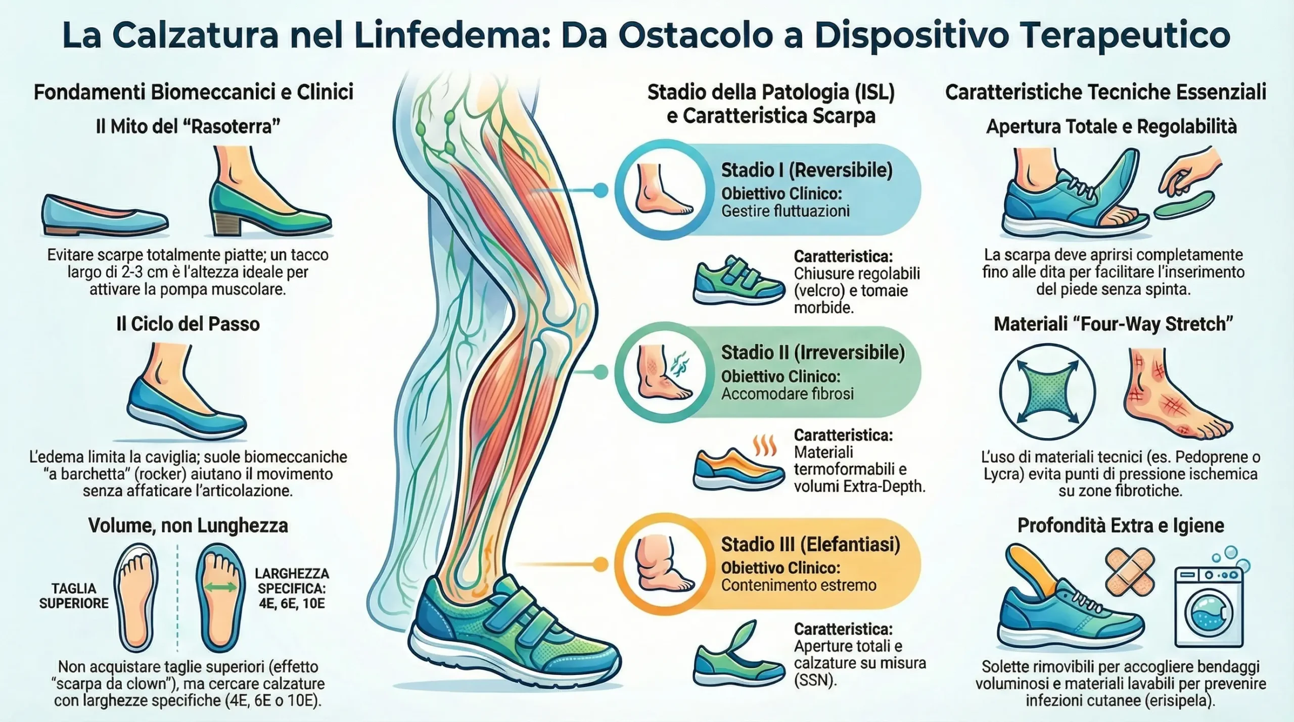 La gestione della calzatura nel paziente con linfedema non è un dettaglio estetico, ma un atto medico fondamentale. Una scarpa corretta è il “motore” che permette alla calza compressiva e al bendaggio di lavorare; senza il movimento attivato da una scarpa idonea, la terapia compressiva è statica e inefficace.