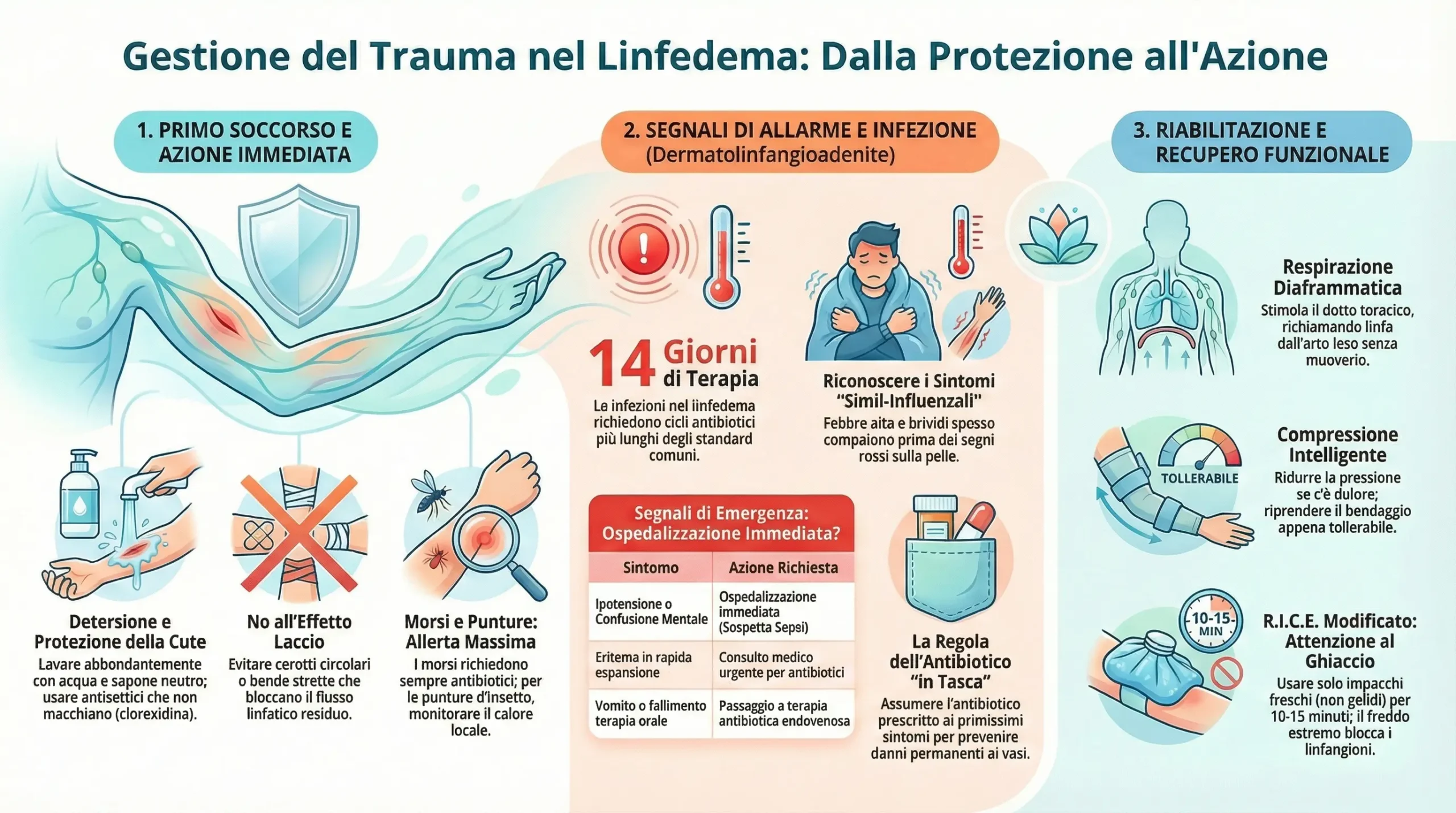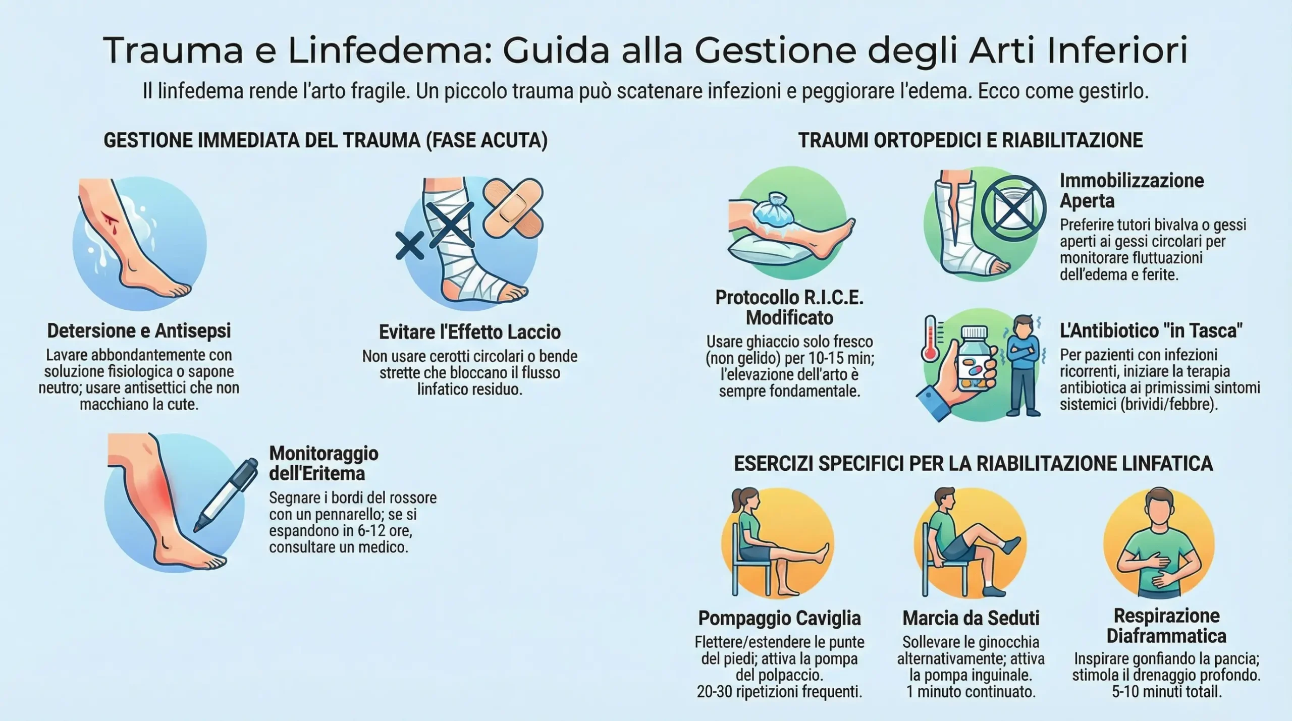 Questo documento è strutturato per fungere da guida operativa e teorica, analizzando la fisiopatologia del danno tissutale nel linfedema, definendo protocolli di primo soccorso e terapia antibiotica avanzata, e proponendo strategie di riabilitazione adattate che non rinuncino alla mobilizzazione ma la modulino in sicurezza. L’obiettivo è trasformare la paura del trauma, spesso paralizzante per il paziente, in una competenza gestionale consapevole, permettendo una vita attiva e piena nonostante la cronicità della condizione.